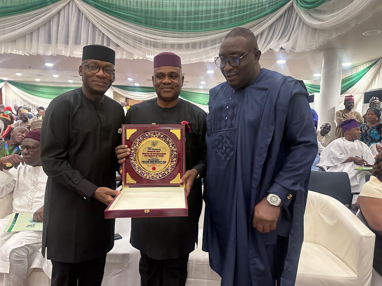 Akwa Ibom State Governor, His Excellency, Pastor Umo Eno was on Saturday night at the Shehu Musa Yar’Adua Centre,Abuja honoured by the Nigeria Union of Journalists with an Award of Excellence in the Development of Media Infrastructure during the Awards/ Dinner marking the 70th Anniversary celebrations of the Professional Body .