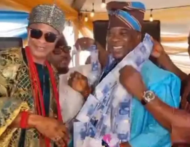 Oba Sowemimo was seen holding strewn Naira notes as a bead and hung onto the neck of a musician in the public.