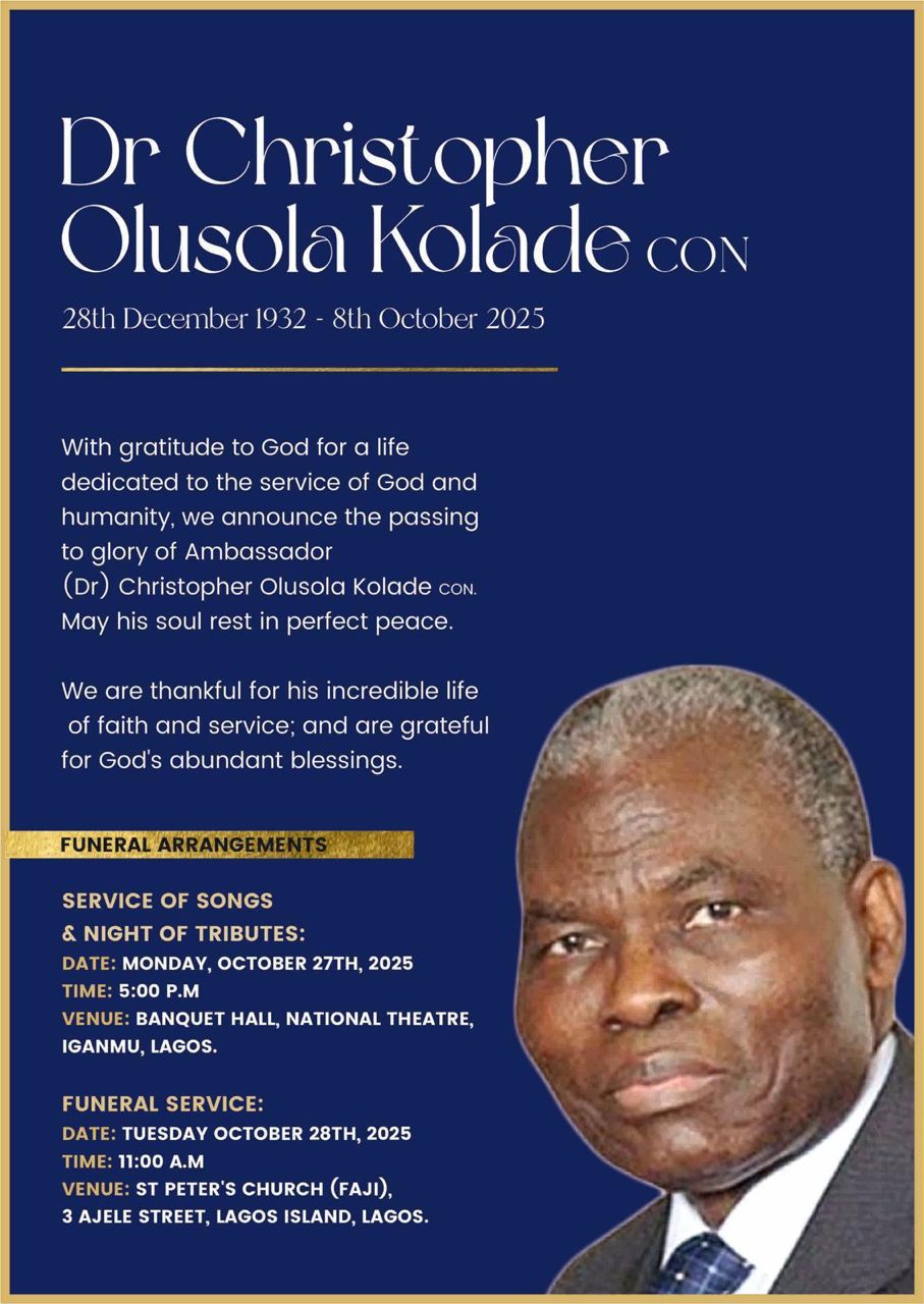 Dr. Kolade, who served as Nigeria’s High Commissioner to the United Kingdom, passed away peacefully on Wednesday, at the age of 92. His family announced the news in a statement on Thursday, expressing gratitude to God for a life “devoted to His service and to humanity.”