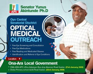 The Optical Medical Outreach Programme organised by Distinguished Senator Yunus Akintunde, representing Oyo Central Senatorial District, has recorded remarkable success across three local government areas within the first two days of the four-day exercise scheduled for Ibadan Outer City Zone of Oyo Central Senatorial District.