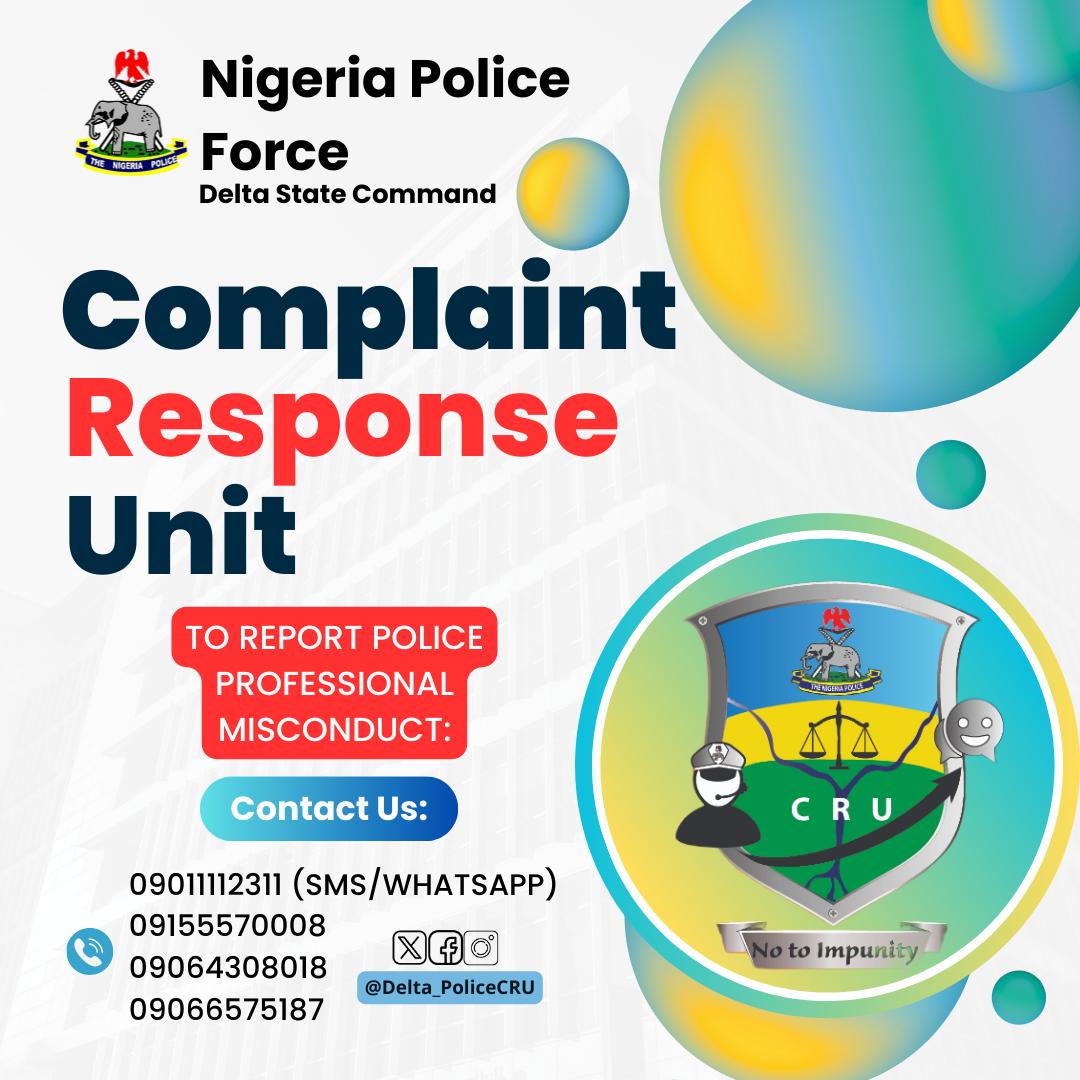 The CP who understands the need to maintain the highest standards of professionalism in the organization, seeks to rectify any excesses or inappropriate behavior demonstrated by the police officers and men of the command. On this note, the public can channel all complaints and relevant information on police actions either by visiting the CRU office at the Command Headquarters, or by contacting any of the following phone numbers: 09155570008 | 09011112311 | 09064308018 | 09066575187; or via the social media handle: (X – Delta_PoliceCRU; FACEBOOK – DeltaNG CRU INSTAGRAM: @Delta_PoliceCRU); and the official email – deltapolicecru@gmail.com