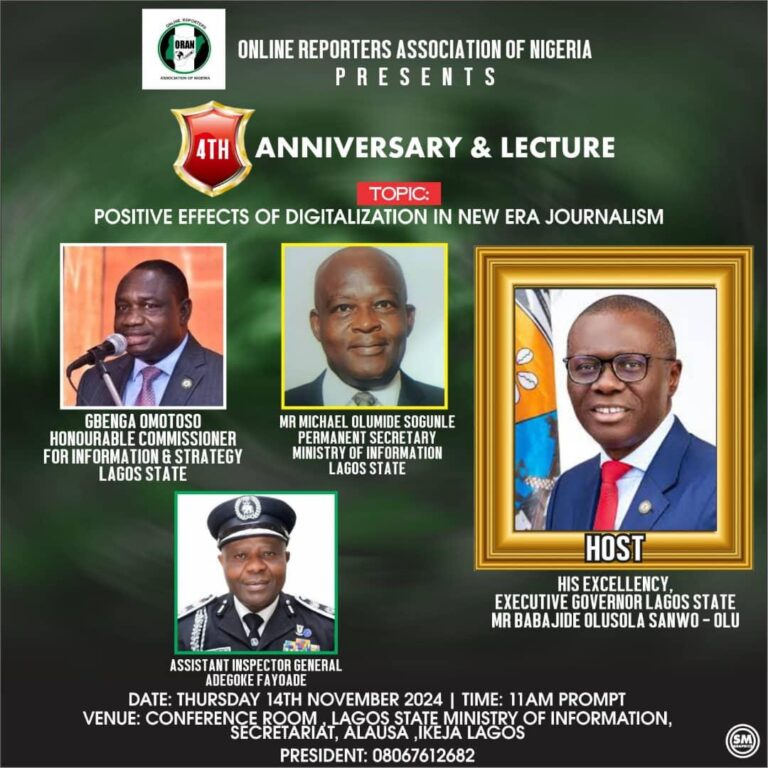 All is now set for the Online Reporters Association Nigeria 4th Anniversary & Lecture scheduled to hold on Thursday, 14th November 2024 at the Conference Room of Lagos State Ministry Of Information Secretariat, Alausa Ikeja, Lagos.