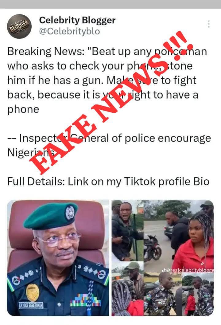 The Nigeria Police Force wishes to address a viral fake news story that has emerged, claiming that Inspector-General of Police, IGP Kayode Adeolu Egbetokun, Ph.D., NPM., has instructed citizens to physically assault and throw stones at police officers who request to search their phones.