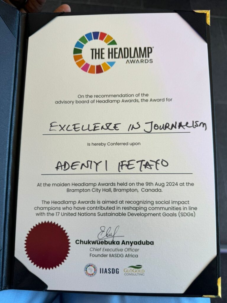 Home » Journalist Adeniyi Ifetayo Honored with ‘Excellence in Journalism’ at The Headlamp Awards in Canada