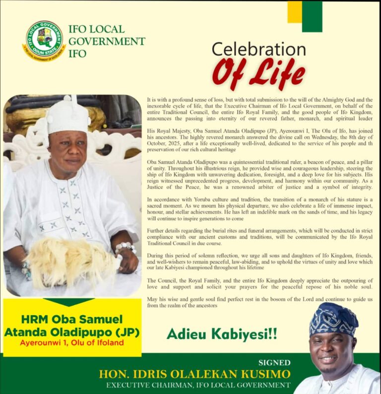 His Royal Majesty, Oba Samuel Atanda Oladipupo (JP), Ayerounwi I, The Olu of Ifo, has joined his ancestors. The highly revered monarch answered the divine call on Wednesday, the 8th day of October, 2025, after a life exceptionally well-lived, dedicated to the service of his people and the preservation of our rich cultural heritage.