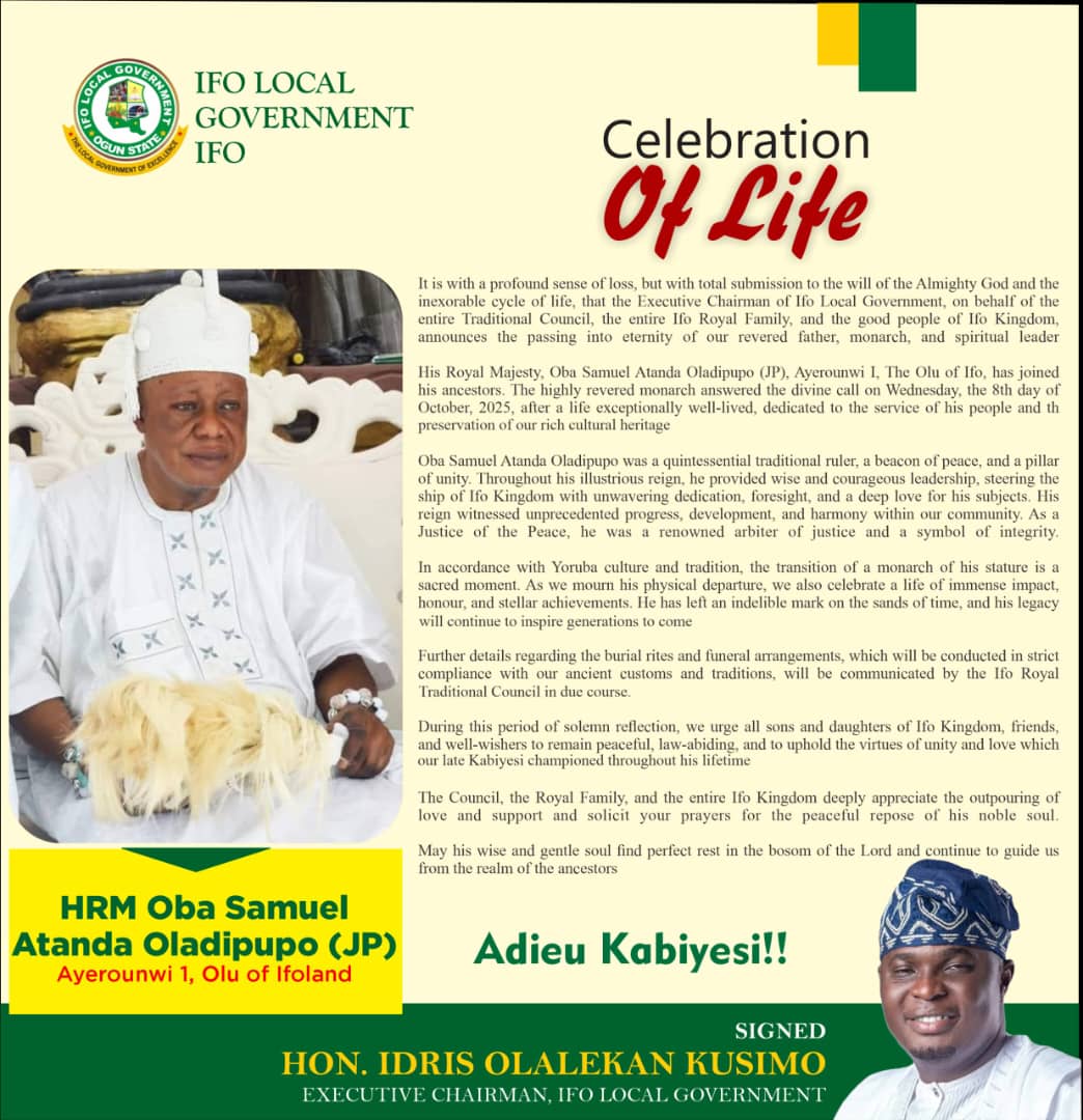 It is with a profound sense of loss, but with total submission to the will of the Almighty God and the inexorable cycle of life, that the Executive Chairman of Ifo Local Government, on behalf of the entire Traditional Council, the entire Ifo Royal Family, and the good people of Ifo Kingdom, announces the passing into eternity of our revered father, monarch, and spiritual leader.