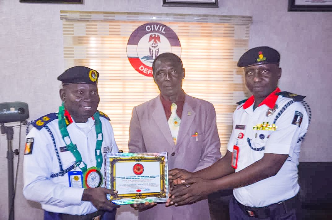The State Commandant, Nigeria Security and Civil Defence ( NSCDC ), Mr Adedotun Keshinro was awarded, today, Tuesday, 5th November, 2024, by Barr. Desmond Rinse, Country Representative/ Head of Research African Emerging Leadership, Research and Development Organization.