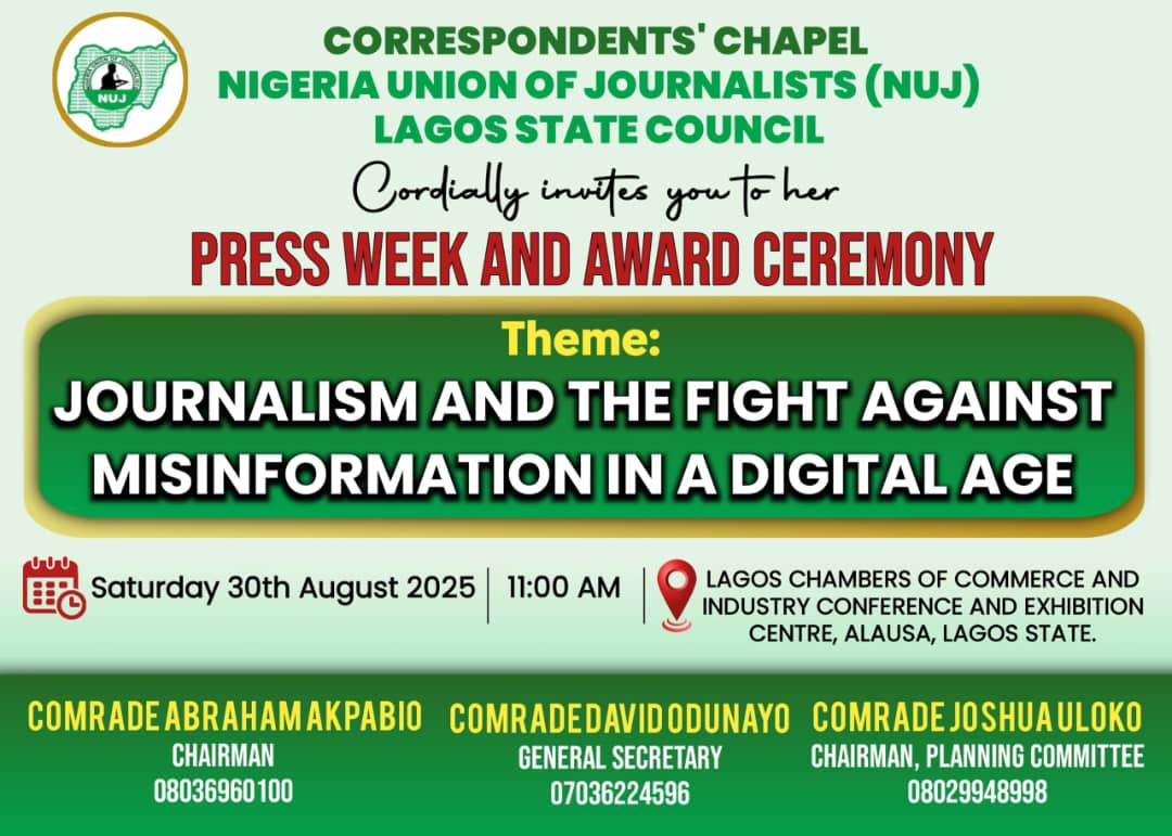 The Correspondents’ Chapel of the Nigeria Union of Journalists (NUJ), Lagos State Council, today held the Main Event of its 2025 Press Week and Award Ceremony at the LCCI Conference and Exhibition Centre, Alausa, Ikeja, with stakeholders reaffirming the urgent need for ethical journalism in the fight against misinformation in Nigeria’s digital age.