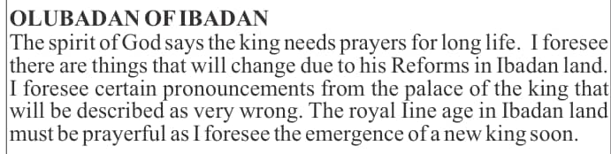 “OLUBADAN OF IBADAN:The spirit of God says the king needs prayers for long life. I foresee there are things that will change due to his Reforms in Ibadan land. I foresee certain pronouncements from the palace of the king that will be described as very wrong. The royal Iine age in Ibadan land must be prayerful as I foresee the emergence of a new king soon” (Pg 144)