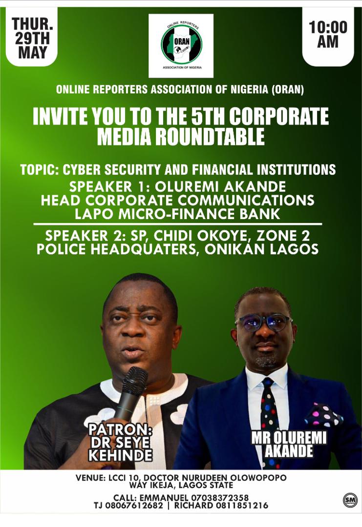 The Online Reporters Association of Nigeria (ORAN) is set to host 5th corporate/media crucial roundtable discussion on cybersecurity in financial institutions.