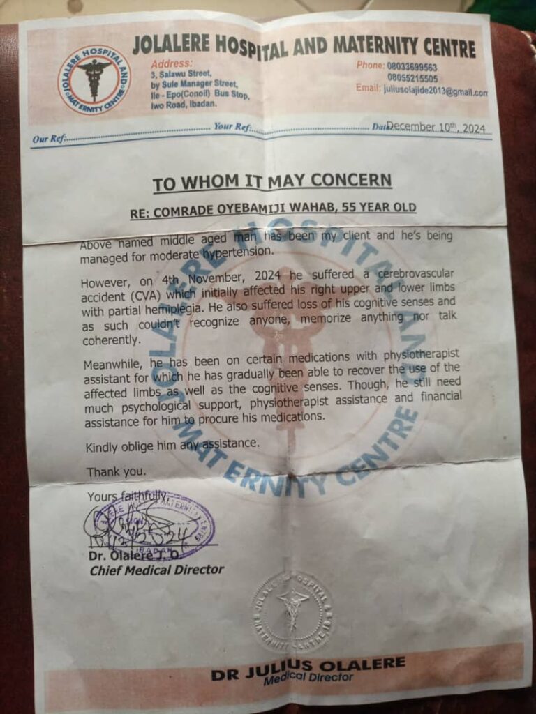According to medical report issued on December 10, 2024 by Dr Olalere , Comrade Awa Bamiji, though gradually recovering, he still needs not only physiotherapist assistance but also psychological and financial support for him to procure his medications.