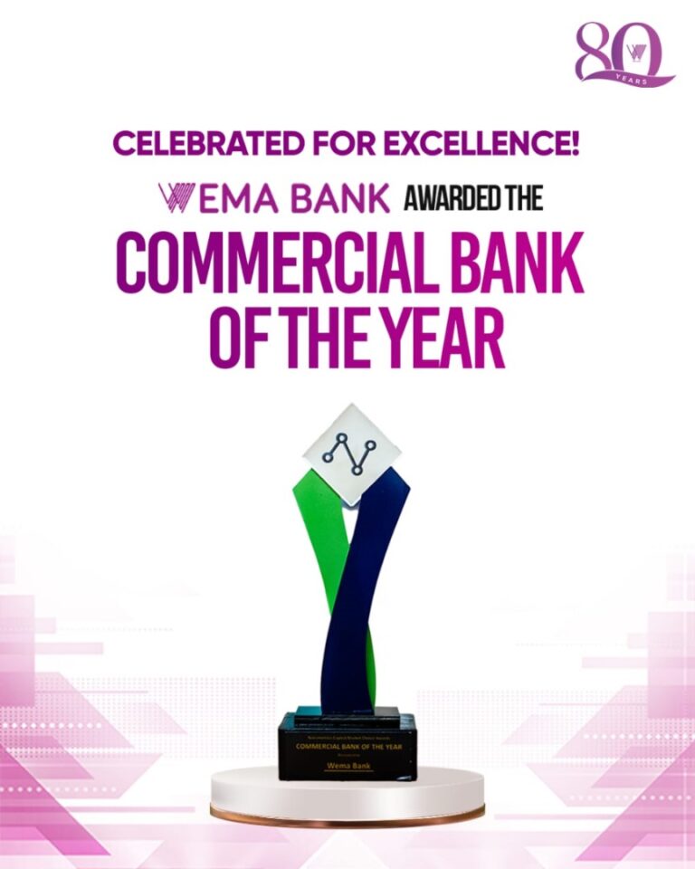 Wema Bank, Nigeria’s most innovative bank and pioneer of Africa’s first fully digital bank, ALAT, has been announced as the winner of the ‘Commercial Bank of the Year’ Award at the 2025 Nairametrics Capital Market Choice Awards (NCMC Awards). The announcement was made at the prestigious awards gala held on May 23rd at the Civic Center in Lagos, where standout performers across Nigeria’s capital markets were celebrated.The Nairametrics Capital Market Choice Awards is a data-driven platform that recognises excellence among publicly listed companies in Nigeria. Winners are selected based on key metrics such as revenue growth, profitability, return on equity, and shareholder value creation. The 2025 edition was themed “Capital Market as a Catalyst for Nigeria’s Economic Transformation.”The NCMC Awards recognised Wema Bank for its exceptional financial performance, value creation, and consistent returns to shareholders. In a highly competitive ‘Commercial Bank of the Year category’ that included industry heavyweights, Wema stood out for its record-breaking ₦102 billion profit before tax in 2024, robust year-on-year revenue and profitability growth, and one of the strongest returns on average equity in the sector. The bank’s disciplined execution, investor-focused strategy, and continued leadership in digital innovation further strengthened its capital market appeal, making it a clear choice for the award and a rising force among Nigeria’s top-tier financial institutions.Receiving this honour during its 80th anniversary year adds profound meaning to the recognition. For eight decades, Wema Bank has continually evolved, transforming from a regional lender into a forward-looking, digitally-led national bank today. Its recognition as ‘Commercial Bank of the Year’ reflects not just recent performance but a sustained commitment to resilience, reinvention, and excellence.Commenting on the award, Moruf Oseni, Managing Director and Chief Executive Officer of Wema Bank, said, “Being named Commercial Bank of the Year is a powerful affirmation of the bold choices we’ve made to transform our business and deliver real value to our stakeholders. It’s a proud moment for Wema Bank – every employee, customer, and shareholder who has been part of this journey. As we mark 80 years of impact, this award celebrates the legacy we’re carrying forward and the future we’re determined to shape – one defined by innovation, trust, and sustainable growth.”Wema Bank PLC also earned a nomination in the highly competitive Company of the Year category, where it stood as the only financial institution shortlisted alongside two energy giants. Wema’s presence in both categories underscores its growing reputation as a high-performing, innovation-driven institution within and beyond the banking sector.The NCMC Awards continues to spotlight institutions driving meaningful change and setting new benchmarks in Nigeria’s capital markets. Wema Bank’s dual presence of winning Commercial Bank of the Year and earning a rare nomination in the Company of the Year category reinforces its growing influence beyond traditional banking. It is a testament to the bank’s evolution into a dynamic, future-ready institution delivering impact across sectors.This accolade further highlights Wema Bank’s momentum in 2025, as the institution continues to deliver on its strategic goals while celebrating 80 years of banking excellence and innovation.